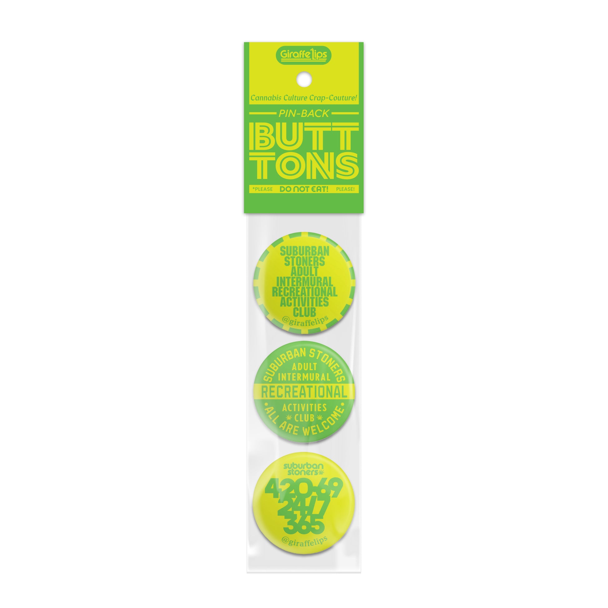 Set 2 includes: 420-69 / 24/7 / 365, Suburban Stoner Badge, and Suburban Stoner Stack