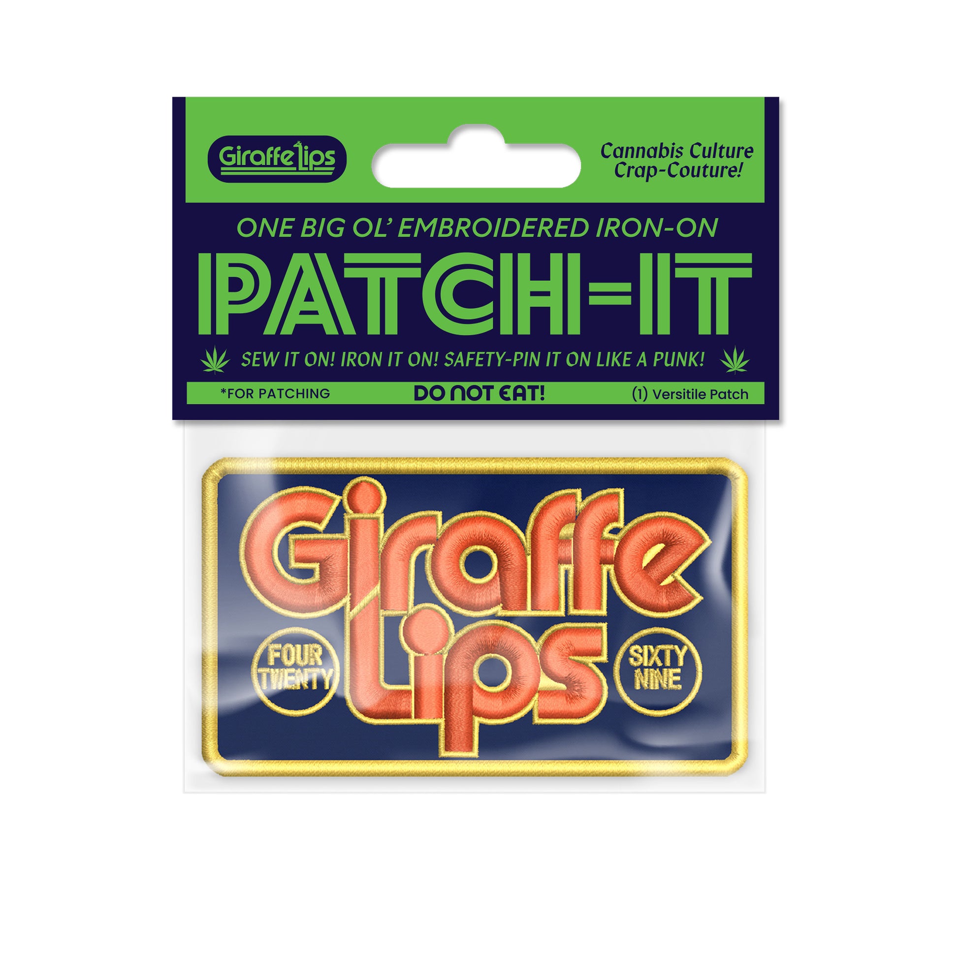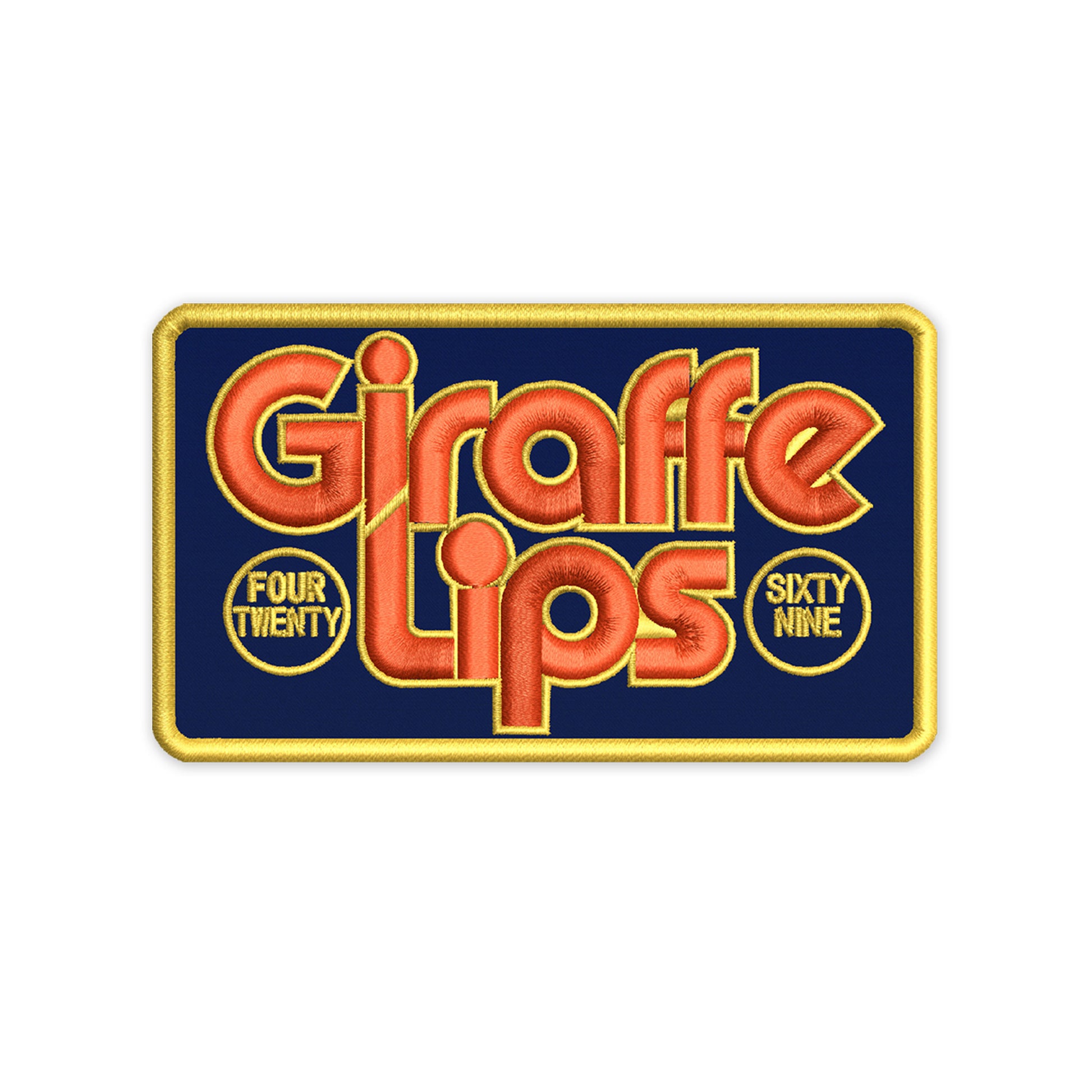 "Giraffe Lips Four-Twenty / Sixty-Nine" iron-on patch. Size appx. 2.5" x 3.75"