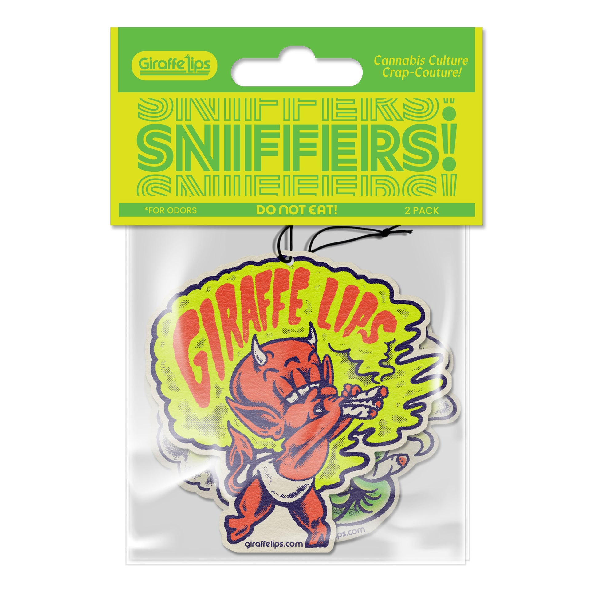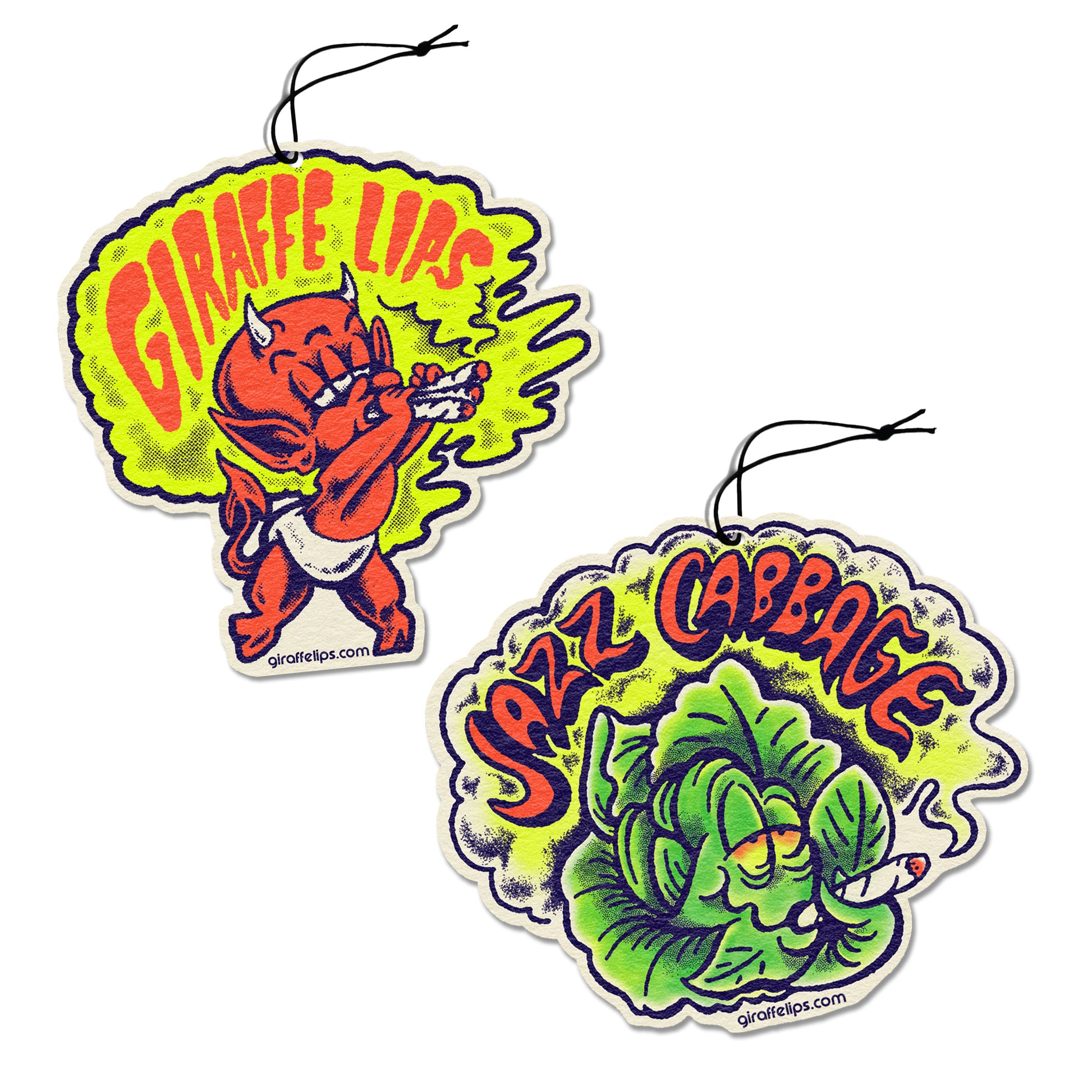 Each pack contains two hangable air fresheners: 1 Little Devil, and 1 Jazz Cabbage